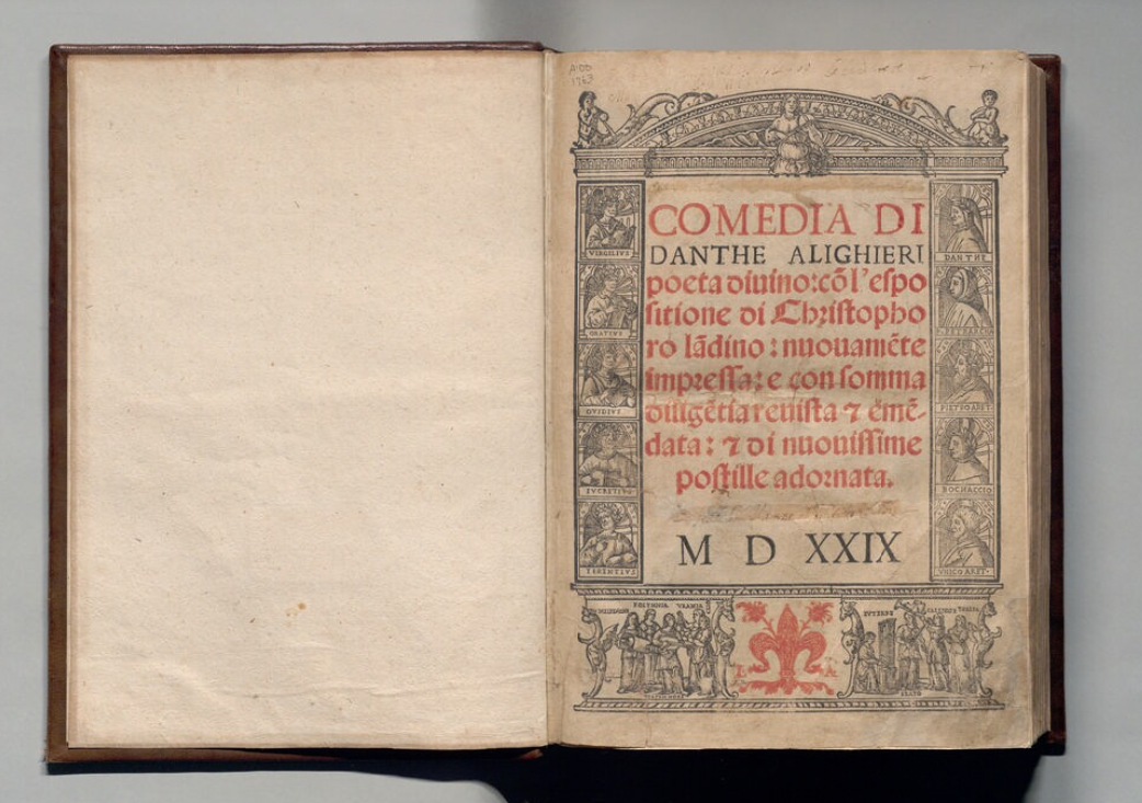 [TGL A100:1763] Comedia di Danthe Alighieri poeta divino: con l’espositione di Christophoro landino: nuovamente impressa, Stampato in Venetia per Iacob del Burgofranco, Pauese. Ad instantia del nobile messere Lucantonio giunta, Fiorentino. Nell'anno del nostro signor MDXXIX. a di XXIII di Genaro