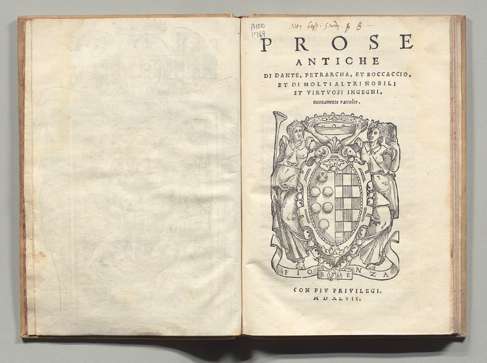 [TGL A100:1769] Prose antiche di Dante, Petrarcha, et Boccaccio, et di molti altri nobili et virtuosi ingegni, nuovamente raccolte, Stampate in Fiorenza appresso il Doni a di primo d’agosto, MDXLVII