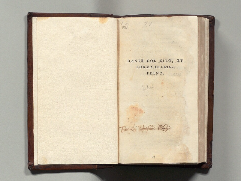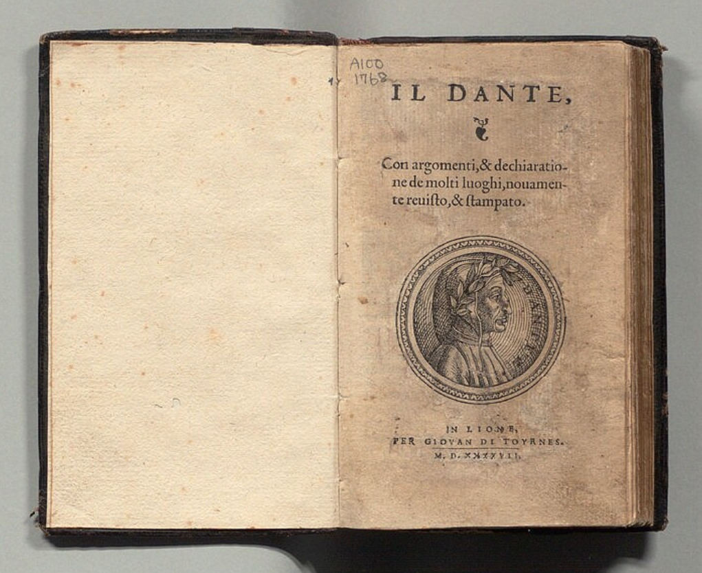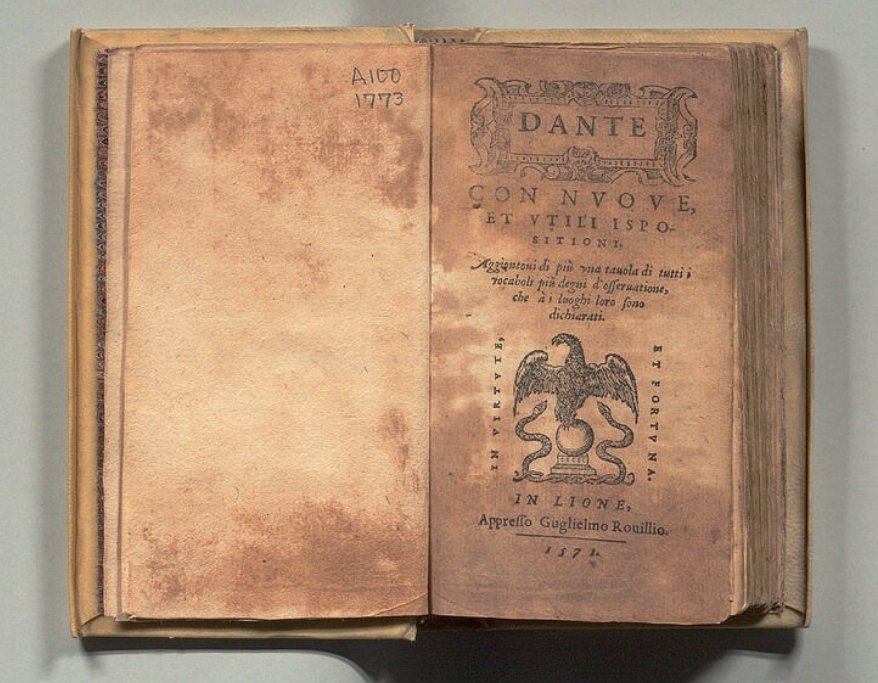 [TGL A100:1773] Dante con nuove et utili ispositioni. Aggiontovi di più una tavola di tutti i vocaboli più degni d’osservatione, che à i luoghi loro sono dichiarati, In Lione, Appresso Guglielmo Rouillio, 1571