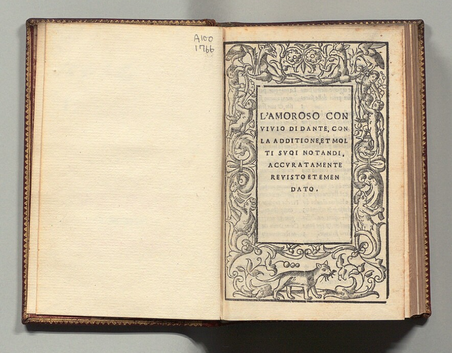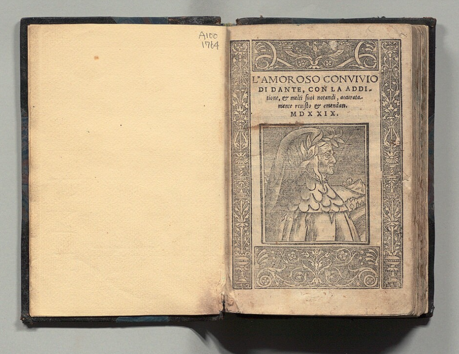 [TGL A100:1764] L’amoroso Convivio di Dante, con la additione, & molti suoi notandi, accuratamente revisto & emendato, Impresso in Vinegia, per Nicolo di Aristotile detto Zoppino, nell’Anno di nostra salute Regnante l’Inclito Principe Andrea Gritti, MDXXIX