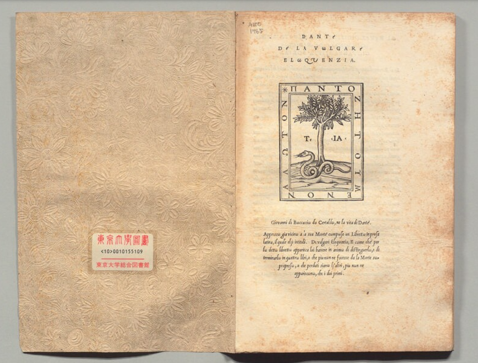 [TGL A100:1765] Dante, De la vulgare eloquenzia; Giovanni di Boccaccio da Certaldo, ne la vita di Dante..., stampata in Vicenza, per Tolomeo Ianiculo da Bressa, Nel anno MDXXIX Del Mese di Genaro