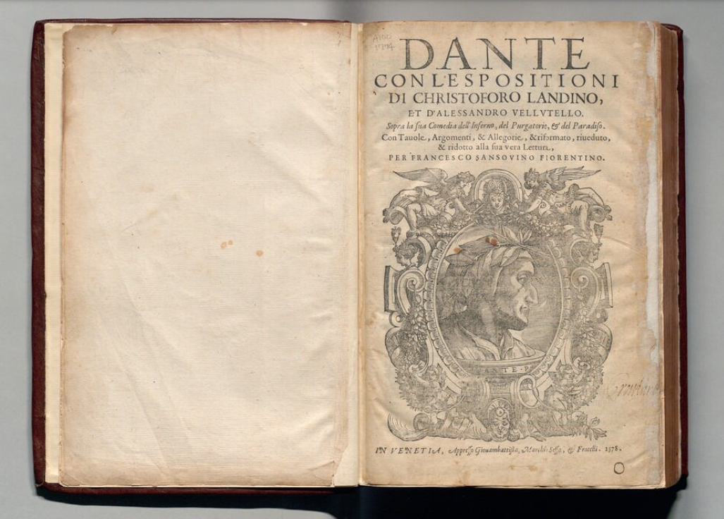 [TGL A100:1767] Comedia del divino poeta Danthe Alighieri, con la dotta & leggiadra spositione di Christophoro Landino, In Vinegia ad instantia di M. Gioanni Giolitto da Trino (In Vineggia, per M. Bernardino Stagnino, MDXXXVI)