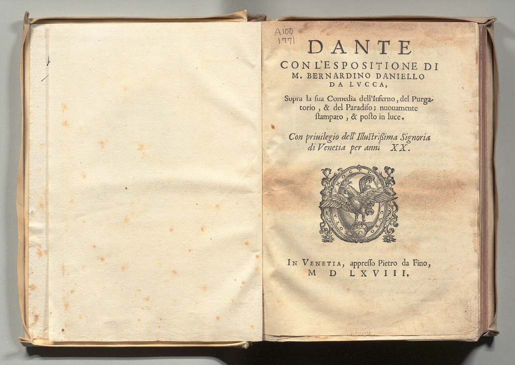 [TGL A100:1771] Dante con l’espositione di m. Bernardino Daniello da Lucca, Sopra la sua Comedia dell’Inferno, del Purgatorio, & del Paradiso; nuovamente stampato, & posto in luce, In Venetia, appresso Pietro da Fino, MDLXVIII