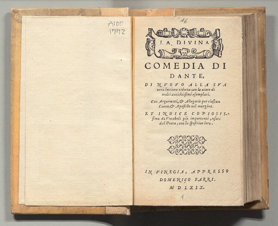 [TGL A100:1772] La Divina Comedia di Dante, di nuovo alla sua vera lettione ridotta con lo aiuto di molti antichissimi esemplari, In Vinegia, appresso Domenico Farri, MDLXIX