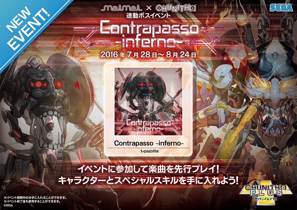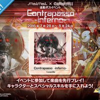 Il rilascio ufficiale di Contrapasso -inferno- è avvenuto nel gioco Chunithm Plus durante un evento speciale tenutosi dal 28 luglio al 24 agosto 2016. Da allora il brano ha acquisito un’aura quasi leggendaria all’interno della community. È stato successivamente incluso anche in Chunithm Super Star, dove è stato reso sbloccabile dal 4 febbraio 2021. La sua notorietà deriva anche dalla difficoltà elevatissima della traccia Master, una delle più complesse mai progettate per il gioco. Cinque designer musicali (ロシェ@ペンギン, Techno Kitchen, 如月ゆかり, Revo@LC, ぴちネコ) hanno collaborato per creare una sfida tecnica e visiva all’altezza del suo contenuto concettuale.