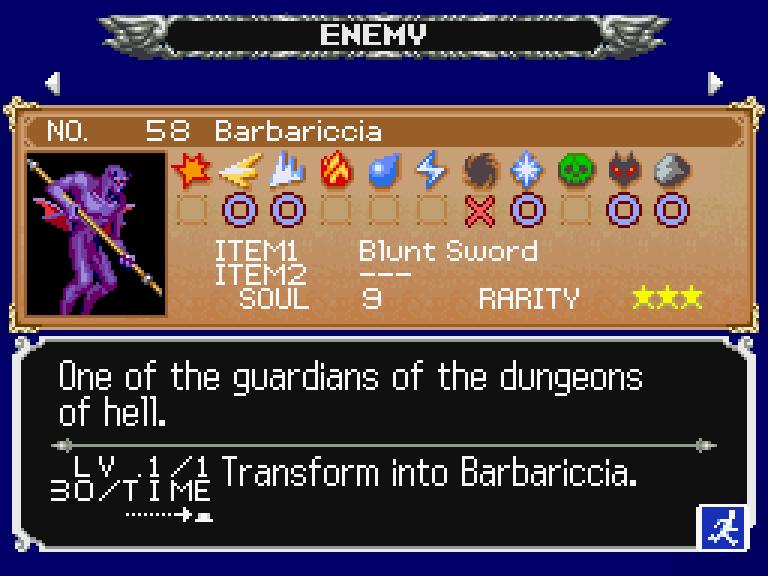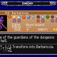 Tra i personaggi affrontabili, compare Barbariccia, un demone viola armato di una lancia a due punte. Si tratta di un nemico agile e pericoloso, che combatte mantenendo la distanza dal giocatore e colpisce con attacchi improvvisi. Sconfiggendolo, Soma Cruz ottiene la sua soul ability, una delle meccaniche centrali del gioco, che gli consente di trasformarsi in un demone particolarmente potente, rafforzando così le sue capacità offensive.