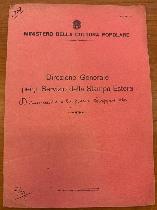 Descrizione dell’opuscolo D’Annunzio e la poesia giapponese edito dall’Ufficio degli Affari culturali del Ministero giapponese degli Affari esteri con lettera di accompagnamento.