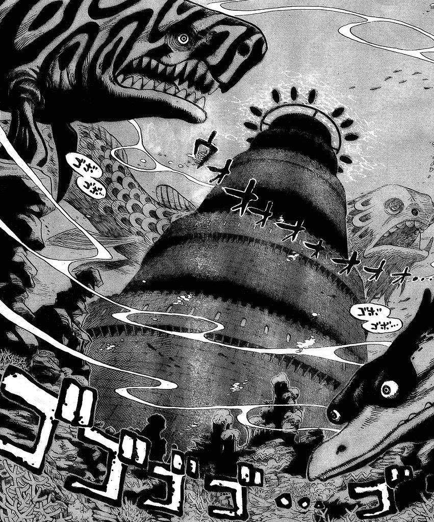 A partire dal capitolo 525 del manga (pubblicato in Giappone il 4 giugno 2009), corrispondente all’episodio 422 dell’anime (1 giugno 2011), prende avvio la saga di Impel Down, la prigione sottomarina di massima sicurezza del Governo Mondiale, situata nella Calm Belt per ostacolare eventuali tentativi di fuga. I prigionieri sono segregati in celle costruite in agalmatolite, materiale in grado di neutralizzare i poteri conferiti dai Frutti del Diavolo. La sorveglianza è garantita da una rete di lumacofoni, telecamere viventi che trasmettono in tempo reale le immagini a un centro di controllo, e da guardie specializzate come i Blugori, esseri umanoidi con caratteristiche animali.